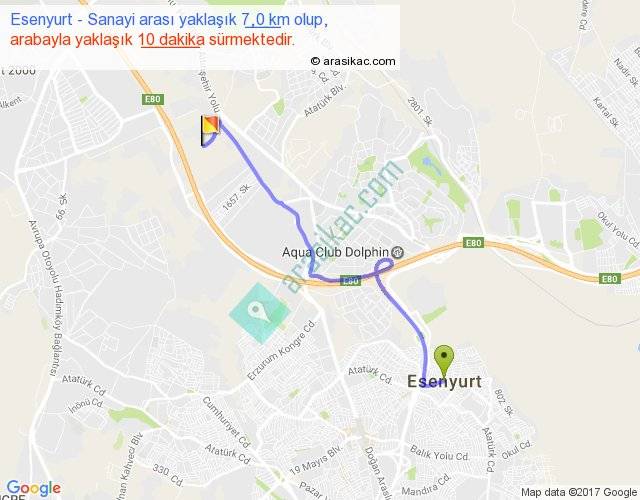 Esenyurt - Sanayi arası yaklaşık olarak 90 km/h ile yukarıda belirtilen sürede olup, iki yerin kuş uçuşu uzaklığı (mesafesi) 5'dir. Yolculuk otobüsle 13 dakika sürmektedir.