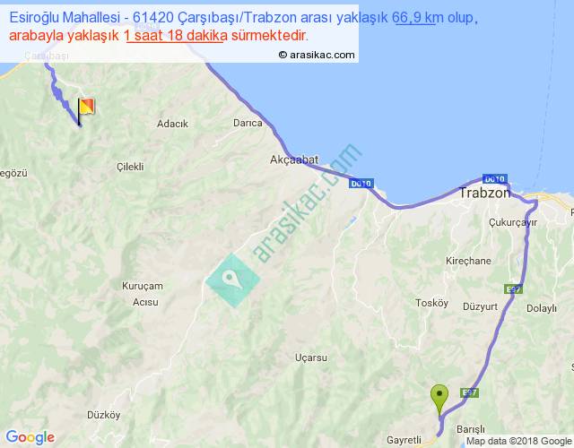 Esiroğlu Mahallesi - 61420 Çarşıbaşı Trabzon arası yaklaşık olarak 90 km/h ile yukarıda belirtilen sürede olup, iki yerin kuş uçuşu uzaklığı (mesafesi) 30'dir. Yolculuk otobüsle 1 saat 41 dakika sürmektedir.