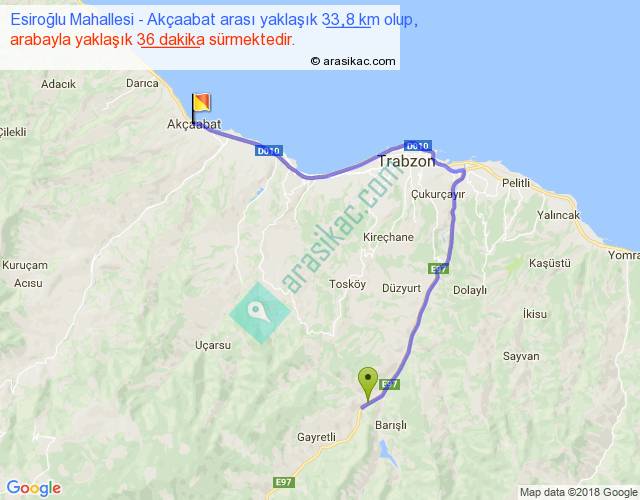Esiroğlu Mahallesi - Akçaabat arası yaklaşık olarak 90 km/h ile yukarıda belirtilen sürede olup, iki yerin kuş uçuşu uzaklığı (mesafesi) 19'dir. Yolculuk otobüsle 46 dakika sürmektedir.