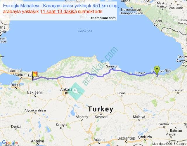 Esiroğlu Mahallesi - Karaçam arası yaklaşık olarak 90 km/h ile yukarıda belirtilen sürede olup, iki yerin kuş uçuşu uzaklığı (mesafesi) 782'dir. Eğer belirtilen yerler arasında uçak seferi var ise bu süre uçakla 1 saat 12 dakika'ya kadar düşebilir. Yolculuk otobüsle 14 saat 34 dakika sürmektedir.