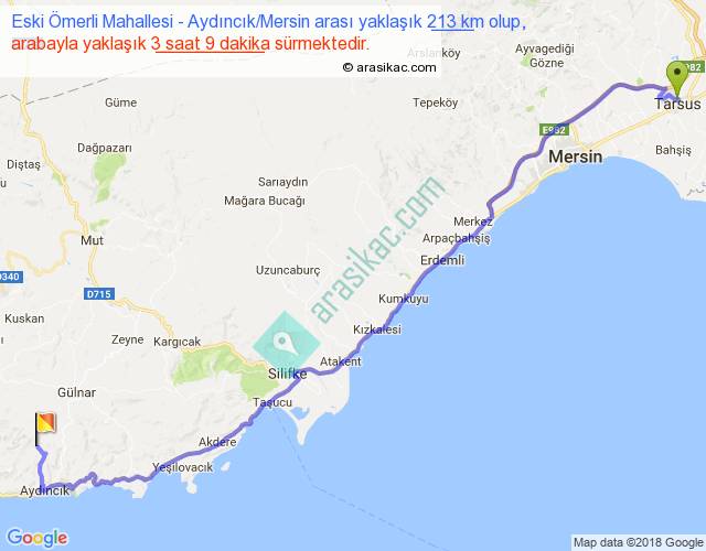 Eski Ömerli Mahallesi - Aydıncık Mersin arası yaklaşık olarak 90 km/h ile yukarıda belirtilen sürede olup, iki yerin kuş uçuşu uzaklığı (mesafesi) 161'dir. Yolculuk otobüsle 4 saat 5 dakika sürmektedir.
