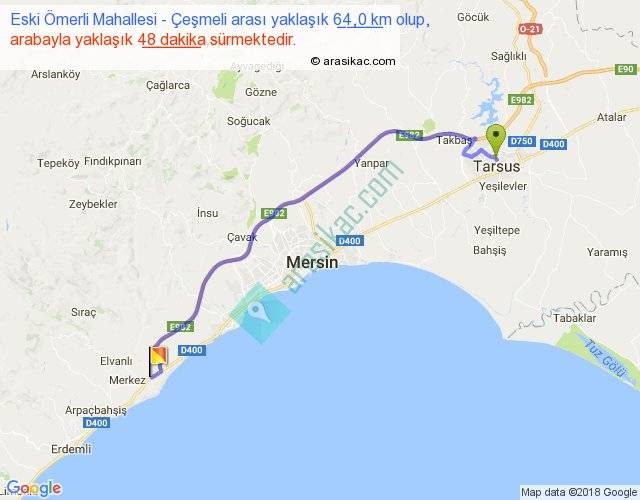 Eski Ömerli Mahallesi - Çeşmeli arası yaklaşık olarak 90 km/h ile yukarıda belirtilen sürede olup, iki yerin kuş uçuşu uzaklığı (mesafesi) 50'dir. Yolculuk otobüsle 1 saat 2 dakika sürmektedir.