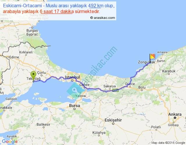 Eskicami-Ortacami - Muslu arası yaklaşık olarak 90 km/h ile yukarıda belirtilen sürede olup, iki yerin kuş uçuşu uzaklığı (mesafesi) 372'dir. Eğer belirtilen yerler arasında uçak seferi var ise bu süre uçakla 34 dakika'ya kadar düşebilir. Yolculuk otobüsle 8 saat 10 dakika sürmektedir.