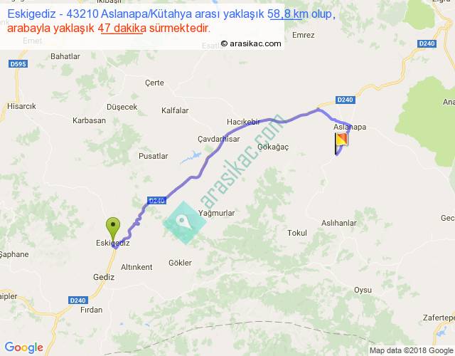 Eskigediz - 43210 Aslanapa Kütahya arası yaklaşık olarak 90 km/h ile yukarıda belirtilen sürede olup, iki yerin kuş uçuşu uzaklığı (mesafesi) 40'dir. Yolculuk otobüsle 1 saat 1 dakika sürmektedir.