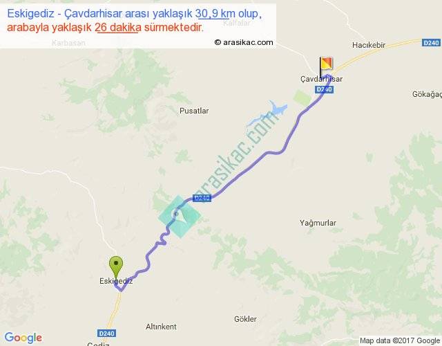 Eskigediz - Çavdarhisar arası yaklaşık olarak 90 km/h ile yukarıda belirtilen sürede olup, iki yerin kuş uçuşu uzaklığı (mesafesi) 25'dir. Yolculuk otobüsle 33 dakika sürmektedir.