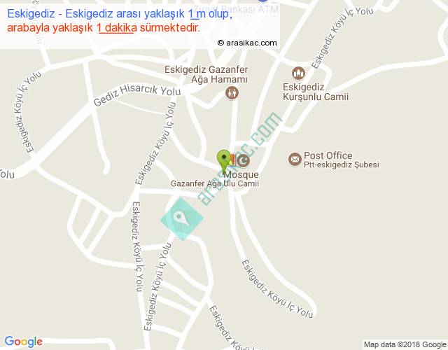Eskigediz - Eskigediz arası yaklaşık olarak 90 km/h ile yukarıda belirtilen sürede olup, iki yerin kuş uçuşu uzaklığı (mesafesi) 0'dir. Yolculuk otobüsle 1 dakika sürmektedir.