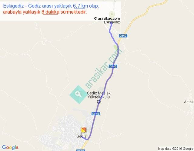 Eskigediz - Gediz arası yaklaşık olarak 90 km/h ile yukarıda belirtilen sürede olup, iki yerin kuş uçuşu uzaklığı (mesafesi) 6'dir. Yolculuk otobüsle 10 dakika sürmektedir.