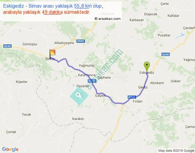 Eskigediz - Simav arası yaklaşık olarak 90 km/h ile yukarıda belirtilen sürede olup, iki yerin kuş uçuşu uzaklığı (mesafesi) 38'dir. Yolculuk otobüsle 1 saat 3 dakika sürmektedir.