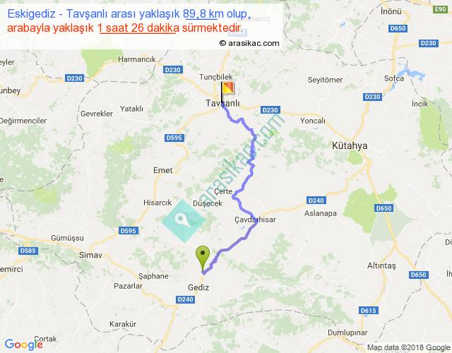 Eskigediz - Tavşanlı arası yaklaşık olarak 90 km/h ile yukarıda belirtilen sürede olup, iki yerin kuş uçuşu uzaklığı (mesafesi) 56'dir. Yolculuk otobüsle 1 saat 51 dakika sürmektedir.
