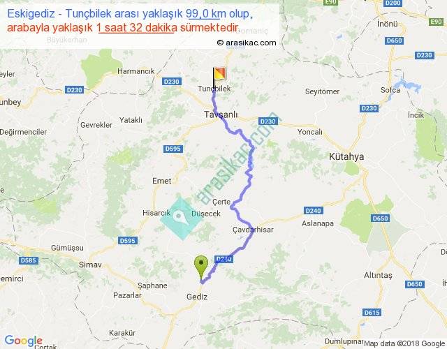 Eskigediz - Tunçbilek arası yaklaşık olarak 90 km/h ile yukarıda belirtilen sürede olup, iki yerin kuş uçuşu uzaklığı (mesafesi) 65'dir. Yolculuk otobüsle 1 saat 59 dakika sürmektedir.