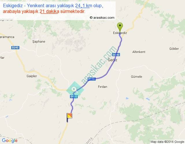 Eskigediz - Yenikent arası yaklaşık olarak 90 km/h ile yukarıda belirtilen sürede olup, iki yerin kuş uçuşu uzaklığı (mesafesi) 21'dir. Yolculuk otobüsle 27 dakika sürmektedir.