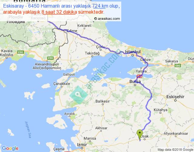Eskisaray - 6450 Harmanlı arası yaklaşık olarak 90 km/h ile yukarıda belirtilen sürede olup, iki yerin kuş uçuşu uzaklığı (mesafesi) 460'dir. Eğer belirtilen yerler arasında uçak seferi var ise bu süre uçakla 42 dakika'ya kadar düşebilir. Yolculuk otobüsle 11 saat 5 dakika sürmektedir.