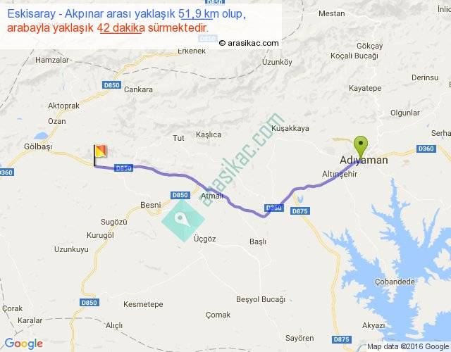 Eskisaray - Akpınar arası yaklaşık olarak 90 km/h ile yukarıda belirtilen sürede olup, iki yerin kuş uçuşu uzaklığı (mesafesi) 45'dir. Yolculuk otobüsle 54 dakika sürmektedir.