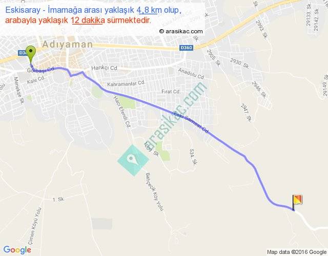 Eskisaray - İmamağa arası yaklaşık olarak 90 km/h ile yukarıda belirtilen sürede olup, iki yerin kuş uçuşu uzaklığı (mesafesi) 4'dir. Yolculuk otobüsle 15 dakika sürmektedir.