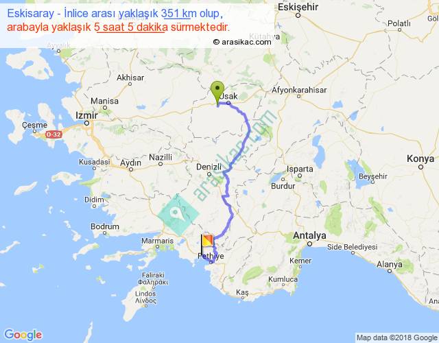 Eskisaray - İnlice arası yaklaşık olarak 90 km/h ile yukarıda belirtilen sürede olup, iki yerin kuş uçuşu uzaklığı (mesafesi) 210'dir. Yolculuk otobüsle 6 saat 36 dakika sürmektedir.