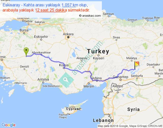 Eskisaray - Kahta arası yaklaşık olarak 90 km/h ile yukarıda belirtilen sürede olup, iki yerin kuş uçuşu uzaklığı (mesafesi) 820'dir. Eğer belirtilen yerler arasında uçak seferi var ise bu süre uçakla 1 saat 15 dakika'ya kadar düşebilir. Yolculuk otobüsle 16 saat 8 dakika sürmektedir.
