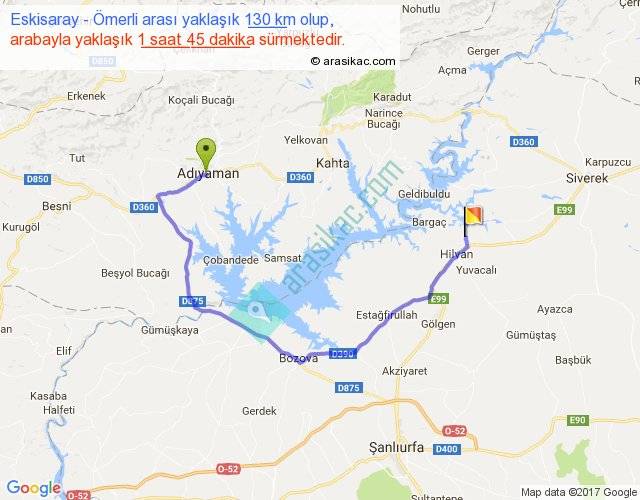 Eskisaray - Ömerli arası yaklaşık olarak 90 km/h ile yukarıda belirtilen sürede olup, iki yerin kuş uçuşu uzaklığı (mesafesi) 64'dir. Yolculuk otobüsle 2 saat 16 dakika sürmektedir.