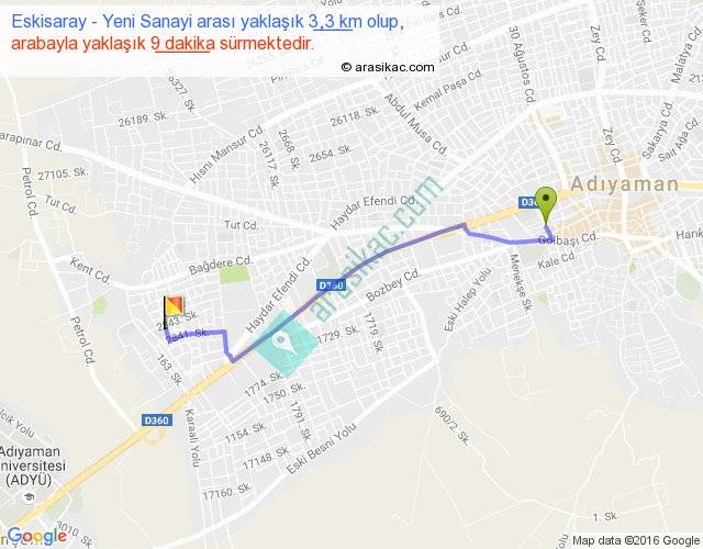 Eskisaray - Yeni Sanayi arası yaklaşık olarak 90 km/h ile yukarıda belirtilen sürede olup, iki yerin kuş uçuşu uzaklığı (mesafesi) 3'dir. Yolculuk otobüsle 11 dakika sürmektedir.