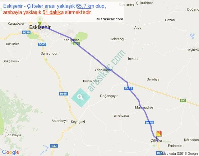 Eskişehir - Çifteler arası yaklaşık olarak 90 km/h ile yukarıda belirtilen sürede olup, iki yerin kuş uçuşu uzaklığı (mesafesi) 61'dir. Yolculuk otobüsle 1 saat 6 dakika sürmektedir.