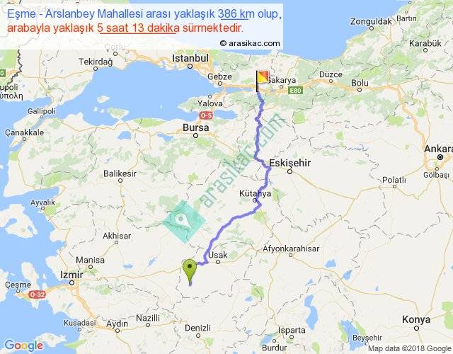 Eşme - Arslanbey Mahallesi arası yaklaşık olarak 90 km/h ile yukarıda belirtilen sürede olup, iki yerin kuş uçuşu uzaklığı (mesafesi) 270'dir. Eğer belirtilen yerler arasında uçak seferi var ise bu süre uçakla 24 dakika'ya kadar düşebilir. Yolculuk otobüsle 6 saat 46 dakika sürmektedir.