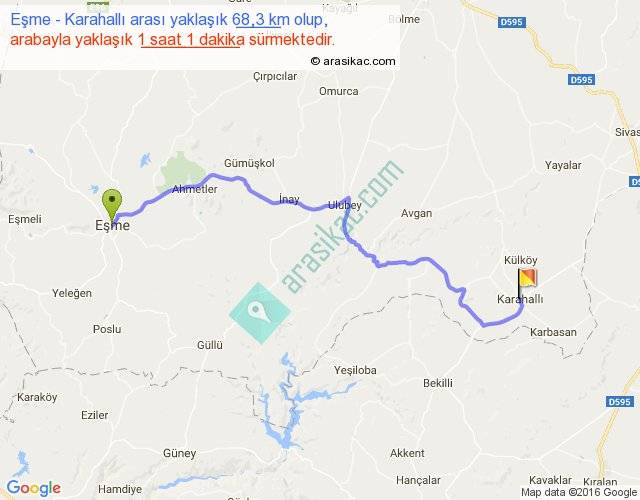 Eşme - Karahallı arası yaklaşık olarak 90 km/h ile yukarıda belirtilen sürede olup, iki yerin kuş uçuşu uzaklığı (mesafesi) 49'dir. Yolculuk otobüsle 1 saat 19 dakika sürmektedir.