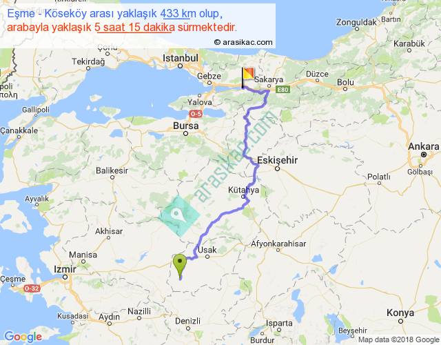 Eşme - Köseköy arası yaklaşık olarak 90 km/h ile yukarıda belirtilen sürede olup, iki yerin kuş uçuşu uzaklığı (mesafesi) 273'dir. Eğer belirtilen yerler arasında uçak seferi var ise bu süre uçakla 25 dakika'ya kadar düşebilir. Yolculuk otobüsle 6 saat 49 dakika sürmektedir.