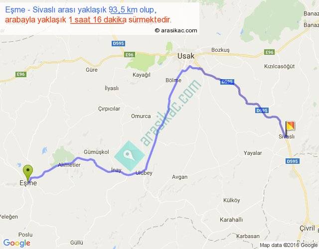 Eşme - Sivaslı arası yaklaşık olarak 90 km/h ile yukarıda belirtilen sürede olup, iki yerin kuş uçuşu uzaklığı (mesafesi) 63'dir. Yolculuk otobüsle 1 saat 38 dakika sürmektedir.