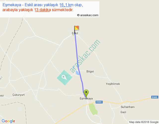 Eşmekaya - Eskil arası yaklaşık olarak 90 km/h ile yukarıda belirtilen sürede olup, iki yerin kuş uçuşu uzaklığı (mesafesi) 16'dir. Yolculuk otobüsle 16 dakika sürmektedir.