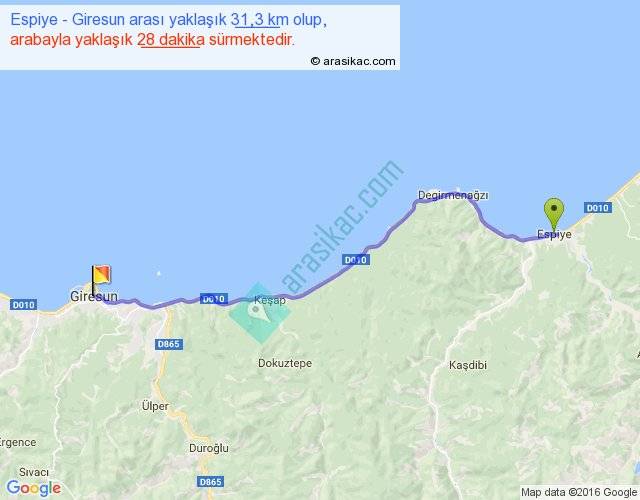 Espiye - Giresun arası yaklaşık olarak 90 km/h ile yukarıda belirtilen sürede olup, iki yerin kuş uçuşu uzaklığı (mesafesi) 27'dir. Yolculuk otobüsle 36 dakika sürmektedir.
