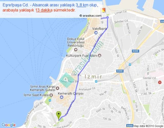 Eşrefpaşa Cd. - Alsancak arası yaklaşık olarak 90 km/h ile yukarıda belirtilen sürede olup, iki yerin kuş uçuşu uzaklığı (mesafesi) 3'dir. Yolculuk otobüsle 16 dakika sürmektedir.