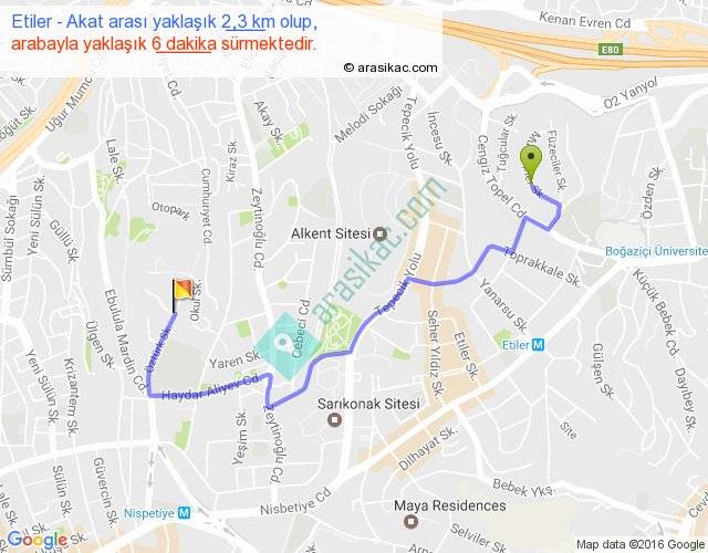 Etiler - Akat arası yaklaşık olarak 90 km/h ile yukarıda belirtilen sürede olup, iki yerin kuş uçuşu uzaklığı (mesafesi) 1'dir. Yolculuk otobüsle 7 dakika sürmektedir.