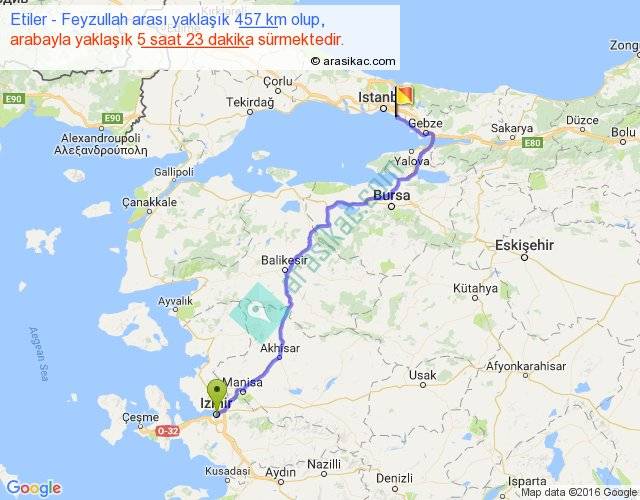 Etiler - Feyzullah arası yaklaşık olarak 90 km/h ile yukarıda belirtilen sürede olup, iki yerin kuş uçuşu uzaklığı (mesafesi) 325'dir. Eğer belirtilen yerler arasında uçak seferi var ise bu süre uçakla 30 dakika'ya kadar düşebilir. Yolculuk otobüsle 6 saat 59 dakika sürmektedir.