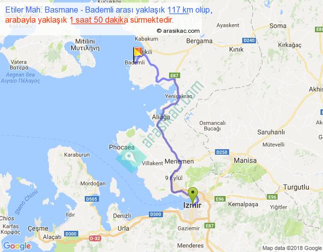 Etiler Mah. Basmane - Bademli arası yaklaşık olarak 90 km/h ile yukarıda belirtilen sürede olup, iki yerin kuş uçuşu uzaklığı (mesafesi) 72'dir. Yolculuk otobüsle 2 saat 23 dakika sürmektedir.