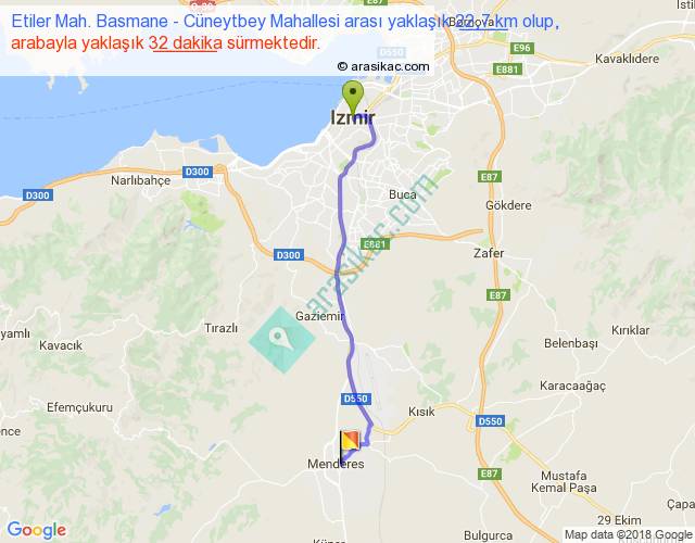 Etiler Mah. Basmane - Cüneytbey Mahallesi arası yaklaşık olarak 90 km/h ile yukarıda belirtilen sürede olup, iki yerin kuş uçuşu uzaklığı (mesafesi) 19'dir. Yolculuk otobüsle 41 dakika sürmektedir.