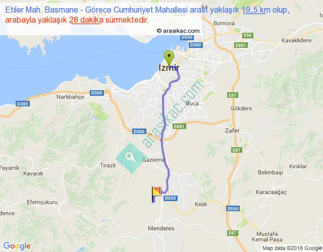 Etiler Mah. Basmane - Görece Cumhuriyet Mahallesi arası yaklaşık olarak 90 km/h ile yukarıda belirtilen sürede olup, iki yerin kuş uçuşu uzaklığı (mesafesi) 16'dir. Yolculuk otobüsle 36 dakika sürmektedir.