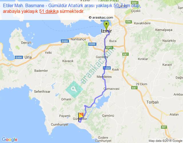 Etiler Mah. Basmane - Gümüldür Atatürk arası yaklaşık olarak 90 km/h ile yukarıda belirtilen sürede olup, iki yerin kuş uçuşu uzaklığı (mesafesi) 39'dir. Yolculuk otobüsle 1 saat 6 dakika sürmektedir.