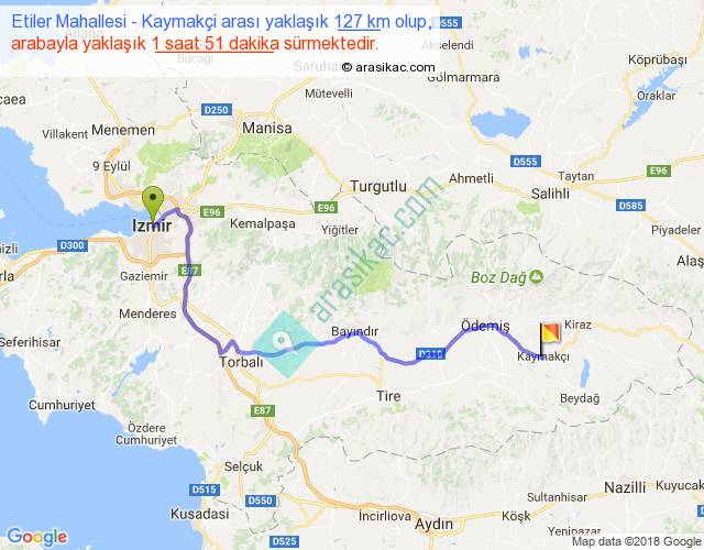 Etiler Mahallesi - Kaymakçi arası yaklaşık olarak 90 km/h ile yukarıda belirtilen sürede olup, iki yerin kuş uçuşu uzaklığı (mesafesi) 89'dir. Yolculuk otobüsle 2 saat 24 dakika sürmektedir.