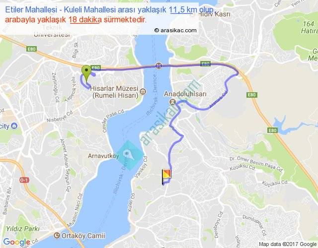 Etiler Mahallesi - Kuleli Mahallesi arası yaklaşık olarak 90 km/h ile yukarıda belirtilen sürede olup, iki yerin kuş uçuşu uzaklığı (mesafesi) 4'dir. Yolculuk otobüsle 23 dakika sürmektedir.