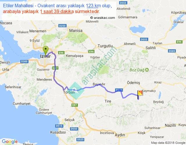 Etiler Mahallesi - Ovakent arası yaklaşık olarak 90 km/h ile yukarıda belirtilen sürede olup, iki yerin kuş uçuşu uzaklığı (mesafesi) 84'dir. Yolculuk otobüsle 2 saat 8 dakika sürmektedir.