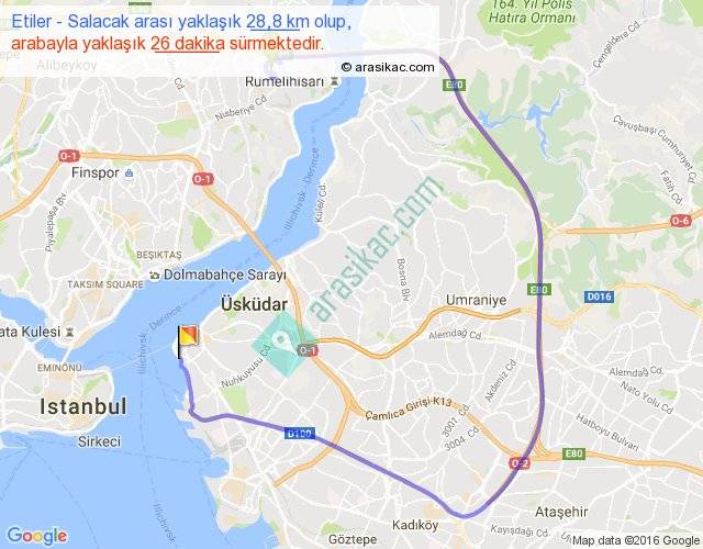 Etiler - Salacak arası yaklaşık olarak 90 km/h ile yukarıda belirtilen sürede olup, iki yerin kuş uçuşu uzaklığı (mesafesi) 478'dir. Eğer belirtilen yerler arasında uçak seferi var ise bu süre uçakla 44 dakika'ya kadar düşebilir. Yolculuk otobüsle 10 saat 5 dakika sürmektedir.
