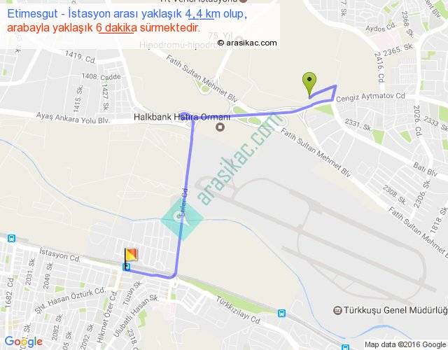 Etimesgut - İstasyon arası yaklaşık olarak 90 km/h ile yukarıda belirtilen sürede olup, iki yerin kuş uçuşu uzaklığı (mesafesi) 3'dir. Yolculuk otobüsle 7 dakika sürmektedir.