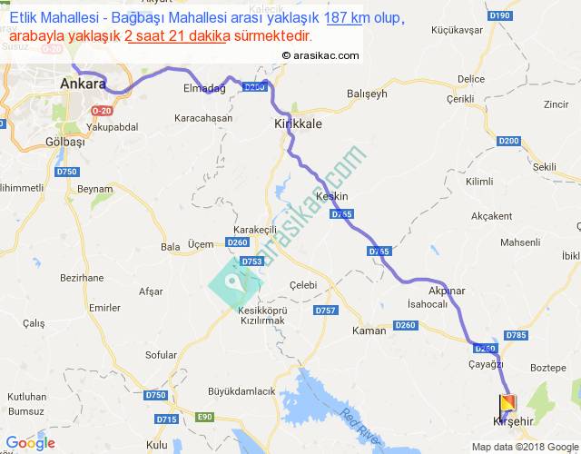 Etlik Mahallesi - Bağbaşı Mahallesi arası yaklaşık olarak 90 km/h ile yukarıda belirtilen sürede olup, iki yerin kuş uçuşu uzaklığı (mesafesi) 144'dir. Yolculuk otobüsle 3 saat 3 dakika sürmektedir.