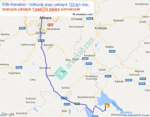 Etlik Mahallesi - Gülhüyük arası yaklaşık olarak 90 km/h ile yukarıda belirtilen sürede olup, iki yerin kuş uçuşu uzaklığı (mesafesi) 116'dir. Yolculuk otobüsle 2 saat 28 dakika sürmektedir.