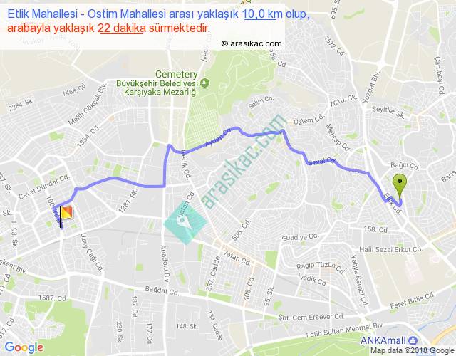 Eğer Etlik Mahallesi Ostim Mahallesi arası ne kadar yakar (benzin/mazot) diyorsanız, kilometrede 3 ₺ yakan bir aracınız var ise 30, km'de 4 ₺ yakan bir aracınız var ise 40, km'de 5 ₺ yakan bir aracınız var ise 50 ile bu yolculuğu tamamlayabilirsiniz.