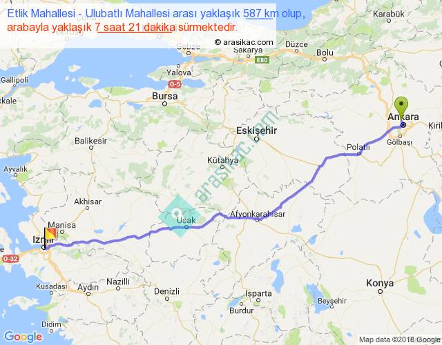 Etlik Mahallesi - Ulubatlı Mahallesi arası yaklaşık olarak 90 km/h ile yukarıda belirtilen sürede olup, iki yerin kuş uçuşu uzaklığı (mesafesi) 515'dir. Eğer belirtilen yerler arasında uçak seferi var ise bu süre uçakla 47 dakika'ya kadar düşebilir. Yolculuk otobüsle 9 saat 33 dakika sürmektedir.