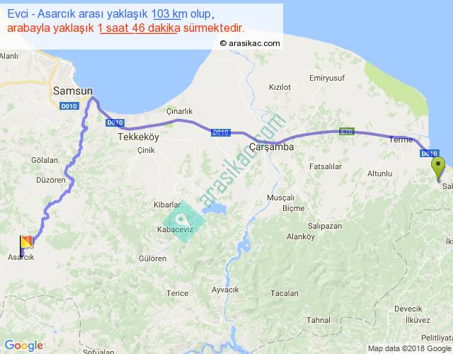 Evci - Asarcık arası yaklaşık olarak 90 km/h ile yukarıda belirtilen sürede olup, iki yerin kuş uçuşu uzaklığı (mesafesi) 69'dir. Yolculuk otobüsle 2 saat 17 dakika sürmektedir.