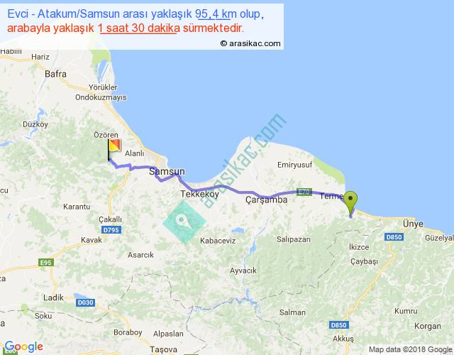 Evci - Atakum Samsun arası yaklaşık olarak 90 km/h ile yukarıda belirtilen sürede olup, iki yerin kuş uçuşu uzaklığı (mesafesi) 80'dir. Yolculuk otobüsle 1 saat 57 dakika sürmektedir.