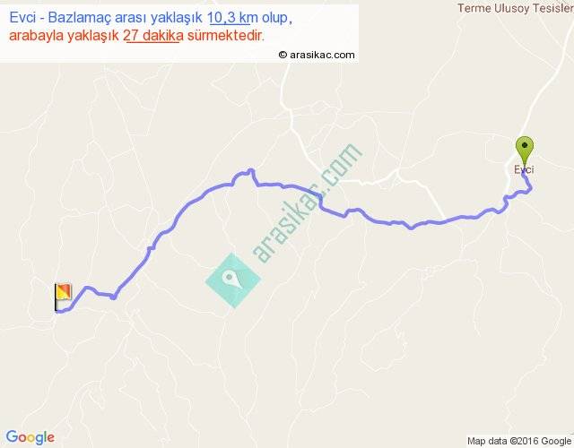 Evci - Bazlamaç arası yaklaşık olarak 90 km/h ile yukarıda belirtilen sürede olup, iki yerin kuş uçuşu uzaklığı (mesafesi) 8'dir. Yolculuk otobüsle 35 dakika sürmektedir.