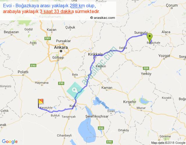 Evci - Boğazkaya arası yaklaşık olarak 90 km/h ile yukarıda belirtilen sürede olup, iki yerin kuş uçuşu uzaklığı (mesafesi) 207'dir. Yolculuk otobüsle 4 saat 36 dakika sürmektedir.