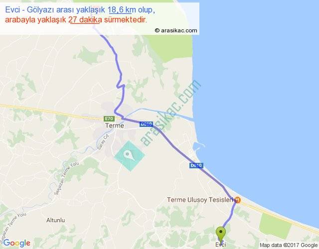 Evci - Gölyazı arası yaklaşık olarak 90 km/h ile yukarıda belirtilen sürede olup, iki yerin kuş uçuşu uzaklığı (mesafesi) 15'dir. Yolculuk otobüsle 35 dakika sürmektedir.